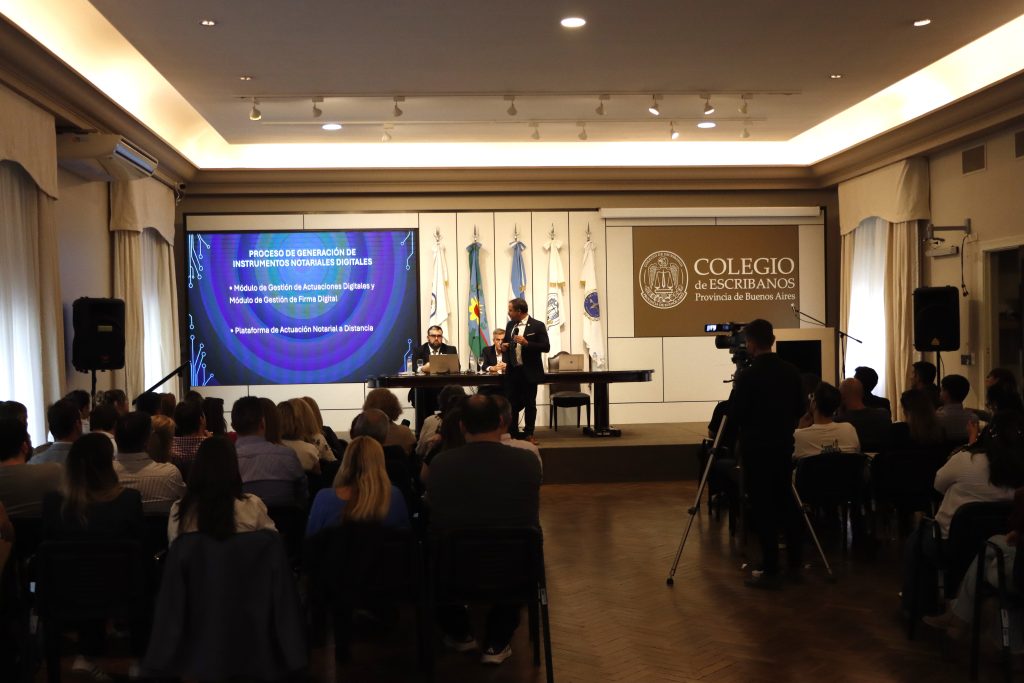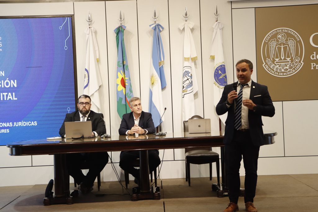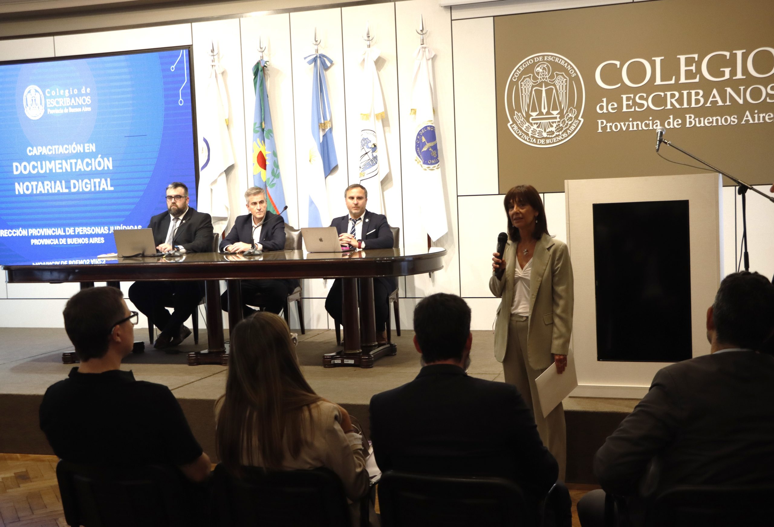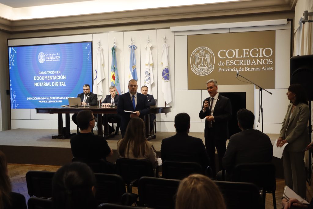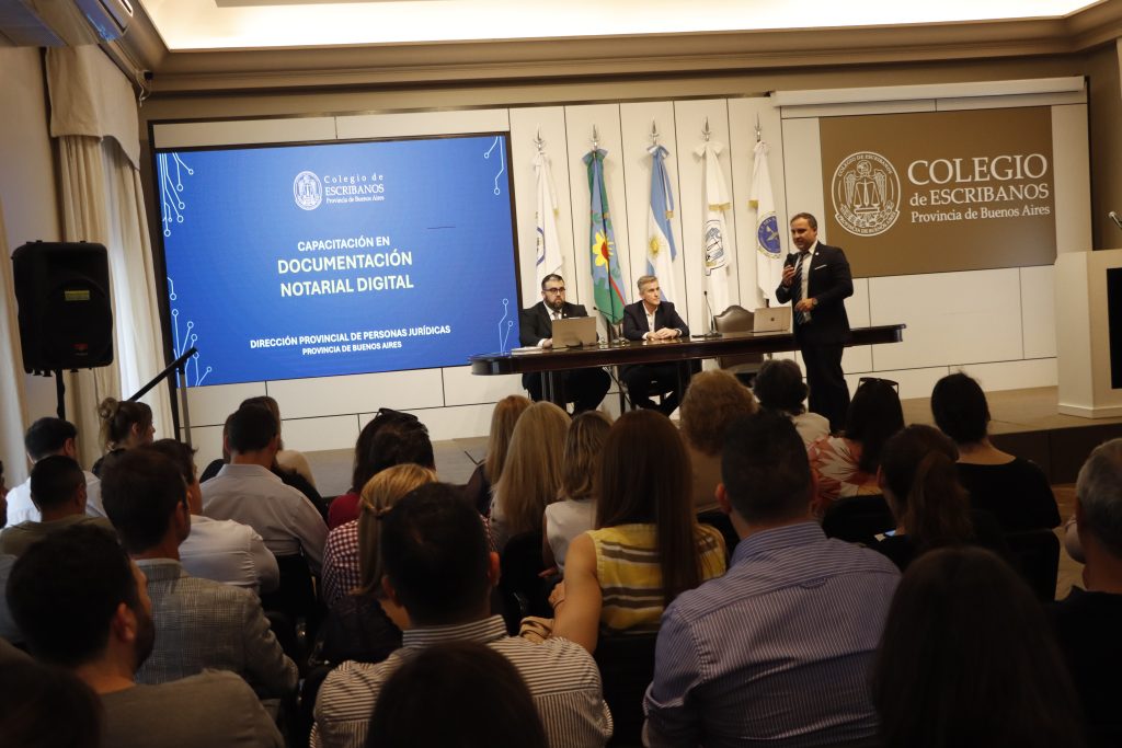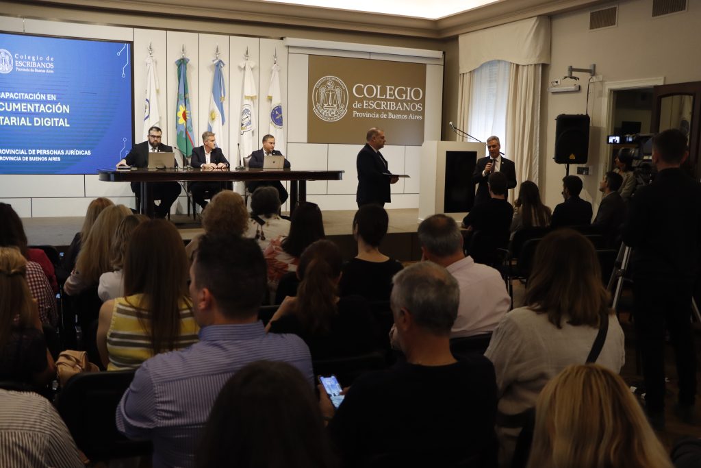 Este jueves 16 de octubre, en el Salón de Actos del Colegio de Escribanos de la Provincia de Buenos Aires, se llevó a cabo una jornada de capacitación sobre documentación notarial digital, organizada por la institución a solicitud de la Dirección Provincial de Personas Jurídicas (DPPJ), dependiente del Ministerio de Justicia y Derechos Humanos bonaerense.