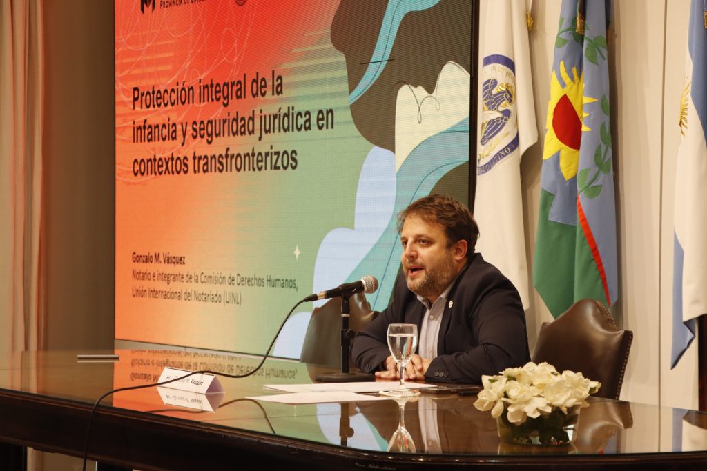 Entre las exposiciones, tuvo un lugar destacado la presentación del notario bonaerense Gonzalo M. Vázquez, integrante de la Comisión de Derechos Humanos de la Unión Internacional del Notariado (UINL), quien disertó sobre “Protección integral de la infancia y seguridad jurídica en contextos transfronterizos”, aportando una mirada técnica y humanista desde la función notarial.