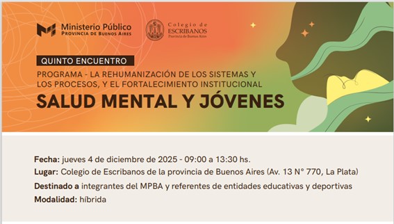 El próximo jueves 4 de diciembre de 2025, de 8:30 a 13:30, el Colegio de Escribanos de la Provincia de Buenos Aires será sede del 5° Encuentro “La rehumanización de los sistemas y los procesos, y el fortalecimiento institucional”, una actividad dedicada al abordaje de la salud mental en jóvenes desde una perspectiva interdisciplinaria.