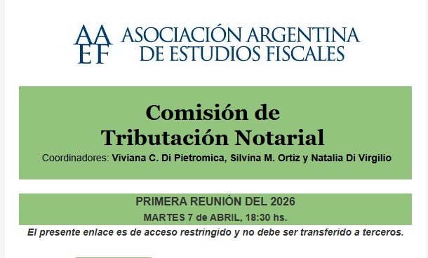 La Comisión de Tributación Notarial de la Asociación Argentina de Estudios Fiscales realizará su primera reunión del año el próximo martes 7 de abril a las 18:30 horas, en modalidad virtual.